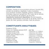 Composition au Poulet : Riz de brasserie, amidon de maïs, froment, farine de gluten de maïs, protéines déshydratées de poulet (20 %) et de dinde, hydrolysat, graines de lin, pulpe de betterave séchée, minéraux, orge, avoine, graisses animales, poudre de racines de gingembre, huile de soja, vitamines, hydrolysat de protéines de lait, oligo-éléments et bêta-carotène. Avec un antioxydant naturel (mélange de tocophérols).