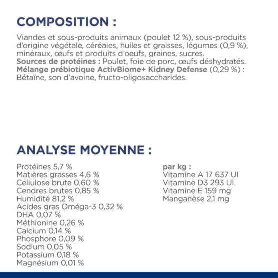 Viandes et sous-produits animaux (poulet 12 %), sous-produits d'origine végétale, céréales, huiles et graisses, légumes (0,9 %), matières minérales, oeufs et produits d'oeufs, graines, sucres. Mélange de prébiotiques ActivBiome+ Kidney Defense (0,29 %) : Bétaïne, son d'avoine, fructo-oligosaccharides. Sources de protéines : Poulet , foie de porc, oeuf en poudre.