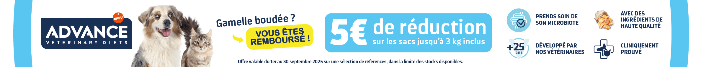 Depuis plus de 25 ans, Advance s'engage à prendre soin des chiens et des chats en leur offrant des Croquettes de qualité, élaborées par des vétérinaires et des nutritionnistes spécialisés. La marque Advance propose une gamme physiologique adaptée pour chiens et chats en les accompagnant tout au long de leur vie grâce à une formule exclusive renforcée avec des probiotiques, prébiotiques et fibres qui contribuent à un microbiote intestinal sain. La gamme médicalisée Advance Veterinary Diets a pour mission d’offrir des solutions de soutien au traitement des principaux problèmes chez les chiens et les chats grâce à ces régimes vétérinaires de qualité, aux résultats prouvés, le tout à un prix abordable.