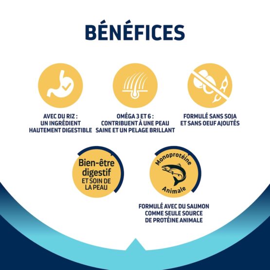 Il est élaboré à partir de saumon comme seule source de protéines animales et de riz. Une recette mono-protéique animale facile à digérer, formulée sans soja ni œuf.