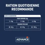 COMPOSITION: Poulet (18 %), riz (18 %), protéines déshydratées de volaille, protéine de maïs, farine de maïs, saindoux, protéines animales hydrolysées (volaille, porc, poisson), sel, chlorure de potassium, pulpe de betterave (0,8 %), huile de poisson, fructo-oligosaccharides, protéines de poisson hydrolysées (source de peptides de poisson) (0,08 %), concentré de mélisse (0,08 %), glucosamine (335 mg/kg), sulfate de chondroïtine (85 mg/kg). CONSTITUANTS ANALYTIQUES : Protéine brute 34 %; matières grasses brutes 13 %; cellulose brute 1,5 %; cendres brutes 7,5 %; calcium 0,9 %; phosphore 0,85 %; sodium 0,8 %; Potassium 1 %; magnésium 0,07 %; Chlorure 2,2 %; Soufre 0,5 %; L-tryptophane 0,35 %. ADDITIFS/kg. Additifs nutritionnels : Vitamine A 27000 UI ; vitamine D3 1200 UI ; vitamine E 660 mg ; citrate de potassium 1 g; sulfate de fer(II) monohydraté 260 mg (Fe : 86 mg) ; iodure de potassium 1,9 mg (I : 1,4 mg) ; sulfate de cuivre(II) pentahydraté 33 mg (Cu : 8,8 mg) ; sulfate manganeux monohydraté 123 mg (Mn : 40 mg) ; sulfate de zinc monohydraté 406mg (Zn : 148 mg) ; sélénite de sodium 0,24mg (Se : 0,1 mg). Additifs zootechniques : Chlorure d'ammonium 5 g. Avec des antioxygènes.