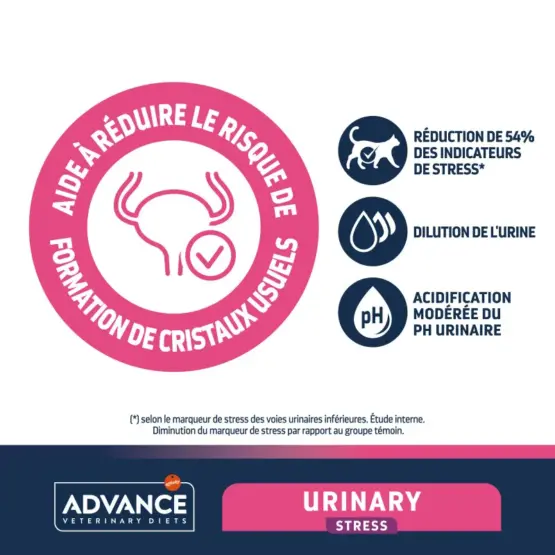 Les résultats de la gamme ADVANCE VETERINARY DIETS Urinary Stress sont cliniquement prouvés : réduction de 54 % des marqueurs de stress, un facteur déclencheur de la cystite idiopathique chez les chats.*