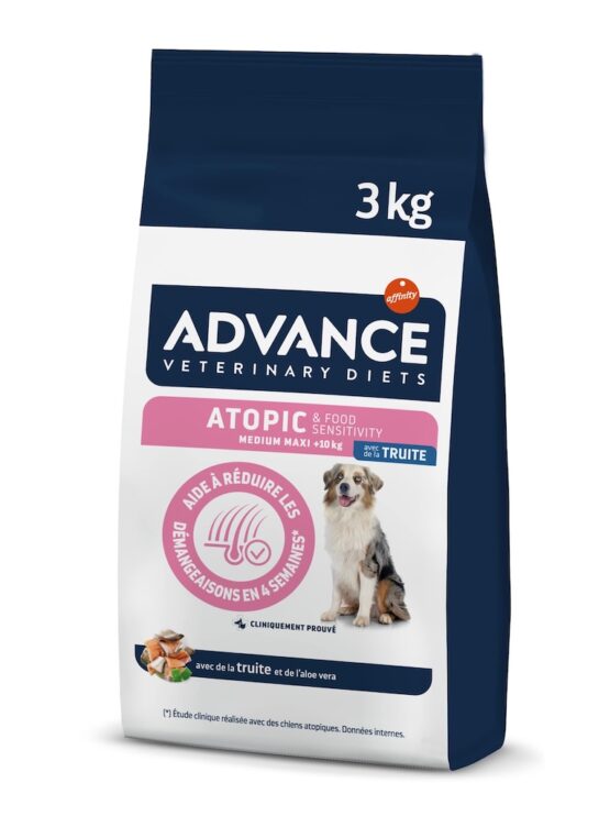 ADVANCE VETERINARY DIETS Atopic Medium/Maxi est un aliment diététique complet et équilibré pour chiens adultes et chiots âgés de plus de 4 mois de moyenne et grande taille.