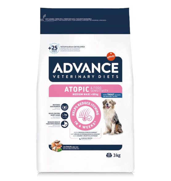 ADVANCE VETERINARY DIETS Atopic Medium/Maxi est un aliment diététique complet et équilibré pour chiens adultes et chiots âgés de plus de 4 mois de moyenne et grande taille, formulé pour traiter la peau en cas de dermatite et de perte de poils excessive, et pour réduire les intolérances aux ingrédients et aux nutriments.