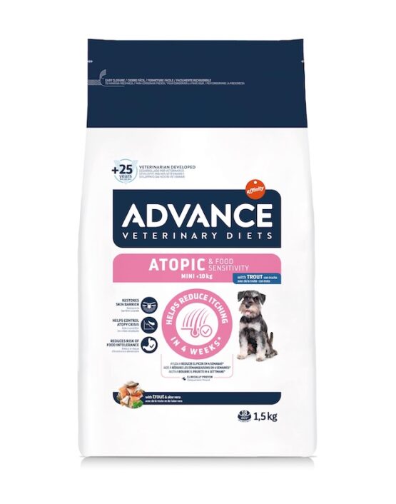 Les croquettes Advance Veterinary Diets Atopic à la truite ont été spécialement formulées pour les chiens de petite taille souffrant de troubles cutanés et constituent un aliment diététique complet.