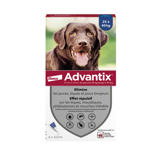 Advantix grand chien 25-40kg est une solution cutanée antiparasitaire externe pour chien.