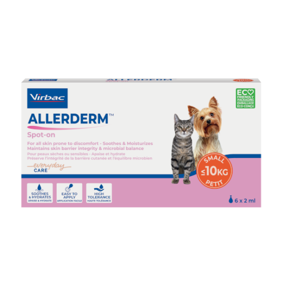 Les pipettes spot-on Allerderm apaisent et hydratent la peau des chiens et des chats tout en préservant l’intégrité de la barrière cutanée et l’équilibre microbien.