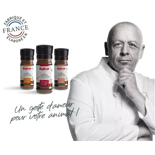 Le moulin, parfumé au canard et à la carotte, est un mélange délicieux que vous pouvez saupoudrer sur la nourriture de votre chien ou chat pour lui donner une saveur irrésistible. Il rehausse le goût des croquettes et terrines Bab’in sans ajouter de calories supplémentaires.