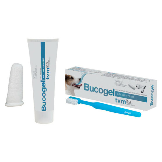 Le kit contient un tube de Bucogel, une brosse à dents douce et un doigtier.