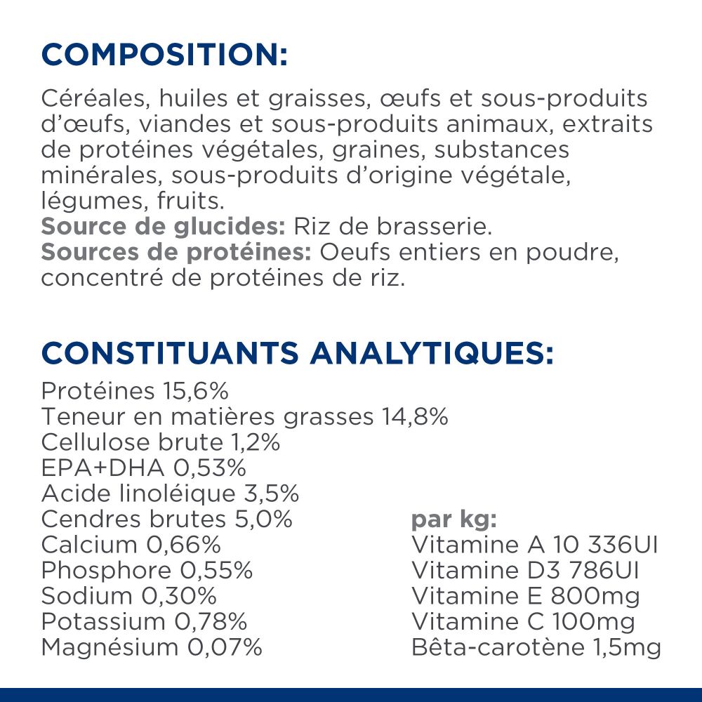• Protéines 15,6%, Teneur en matières grasses 14,5%, Cellulose brute 1,2%, Acides gras essentiels 5,2%, Acide linoléique 3,4%, EPA+DHA 0,53%, Cendres brutes 5,0%, Calcium 0,66%, Phosphore 0,55%, Sodium 0,30%, Potassium 0,78%, Magnésium 0,07%; par kg: Vitamine A 10 336UI, Vitamine D3 732UI, Vitamine E 800 mg, Vitamine C 100 mg, Bêta-carotène 2,5 mg.