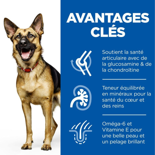 Hill’s Science Plan Canine Mature Adult 6+ Large Breed with chicken est formulé pour renforcer la mobilité, la masse musculaire maigre et la santé des organes vitaux chez les chiens de grande race.