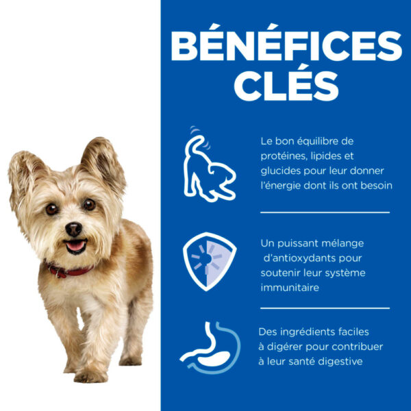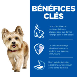 Il s’agit d’une alimentation adaptée aux besoins uniques de votre petit chien afin de l’accompagner en douceur au fil des ans.