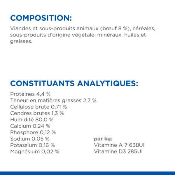 COMPOSITION : Viandes et sous-produits animaux (bœuf 8 %), céréales, sous-produits d’origine végétale, matières minérales, huiles et graisses.