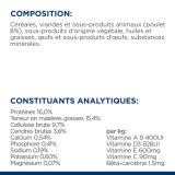 Composition : Céréales, viandes et sous-produits animaux (Poulet 8 %), sous-produits d’origine végétale, huiles et graisses, œufs et sous-produits d’œufs, minéraux. Constituants analytiques : Protéines 16,0%, Teneur en matières grasses 15,4%, Cellulose brute 9,7%, Cendres brutes 3,6%, Calcium 0,54%, Phosphore 0,41%, Sodium 0,19%, Potassium 0,60%, Magnésium 0,07%; par kg : Vitamine A 9 400UI, Vitamine D3 826UI, Vitamine E 600mg, Vitamine C 90mg, Bêta-carotène 1,5mg. Energie Metabolisable (As fed) KCal/100g : 353 Additifs nutritionnels (par kg) : 3b103 (Fer) 75,3mg, 3b202 (Iode) 1,2mg, 3b405 (Cuivre) 7,4mg, 3b502 (Manganèse) 7,8mg, 3b603 (Zinc) 156mg, 3b801 (Sélénium) 0,2mg; avec un antioxydant naturel.
