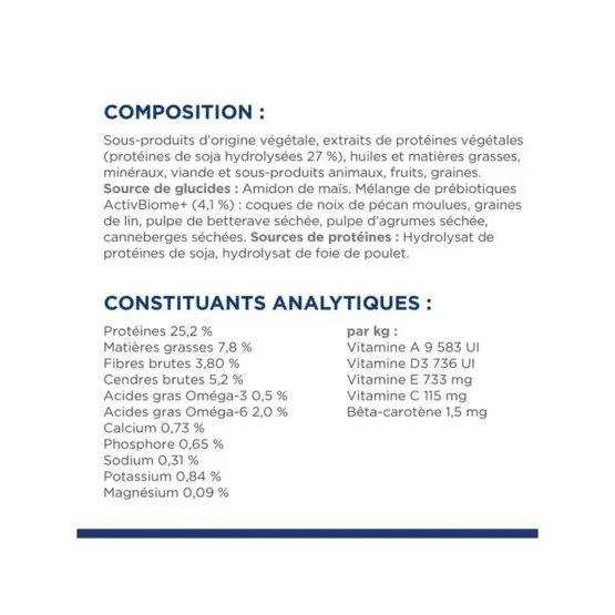 Source de glucides : Amidon de maïs. Mélange prébiotique ActivBiome+ (4,1 %) : coques de noix de pécan moulues, graines de lin, pulpe de betterave séchée, pulpe d'agrumes séchée, canneberges séchées. Sources de protéines : Hydrolysat de protéines de soja, hydrolysat de foie de poulet.