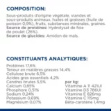 Sous-produits d'origine végétale, viandes et sous-produits animaux, huiles et graisses (huile de poisson 0,9 %), fruits, minéraux, graines. Source de protéines : hydrolysat de foie de poulet (26 %). Source de glucides : Amidon de maïs. CONSTITUANTS ANALYTIQUES : Protéines 17,6%, Teneur en matières grasses 14,4%, Cellulose brute 6,5%, Acides gras essentiels 4,2%, Cendres brutes 5,5%, Calcium 0,85%, Phosphore 0,51%, Sodium 0,24%, Potassium 0,69%, Magnésium 0,07%, par kg : Vitamine A 11421UI, Vitamine D3 786UI, Vitamine E 826mg, Vitamine C 115mg, Bêta-carotène 1,4mg. ADDITIFS : Additifs nutritionnels : 3b103 (Fer) 94,7mg, 3b202 (Iode) 4,1mg, 3b405 (Cuivre) 11,1mg, 3b502 (Manganèse) 9,8mg, 3b603 (Zinc) 147mg, avec un antioxydant naturel. VALEUR ENERGETIQUE: 3534 Kcal/kg