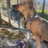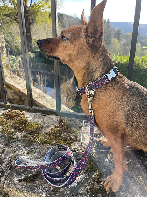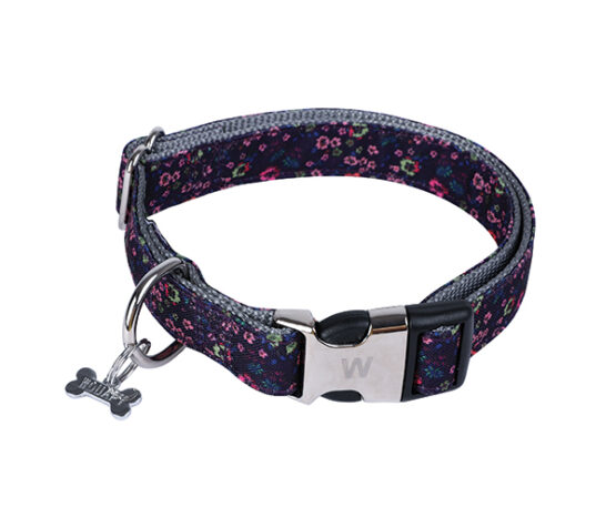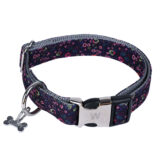 Tissu polyester cousu sur une sangle nylon. Boucle pastique, passant chromé, médaille en forme d’os.
