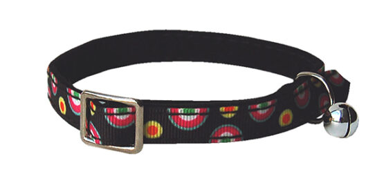 Collier pour chat aux couleurs gaies et vives. Tissu en polyester imprimé avec des motifs tendances. Équipé d’un élastique de sécurité et d’un grelot. Longueur : 33 cm.