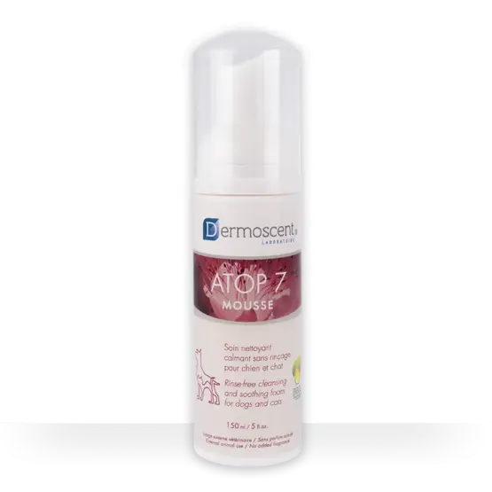 De plus, Dermoscent® ATOP 7® Mousse élimine en douceur les salissures et les allergènes de la surface cutanée sans savon, tout en aidant à réduire les irritations et à apaiser les démangeaisons.