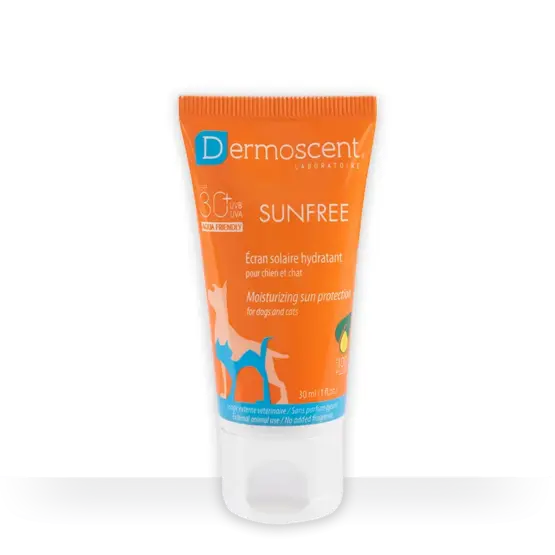 Dermoscent® SunFREE est un écran solaire hydratant et haute protection SPF30+ conçu pour les chiens et les chats à peau sensible.