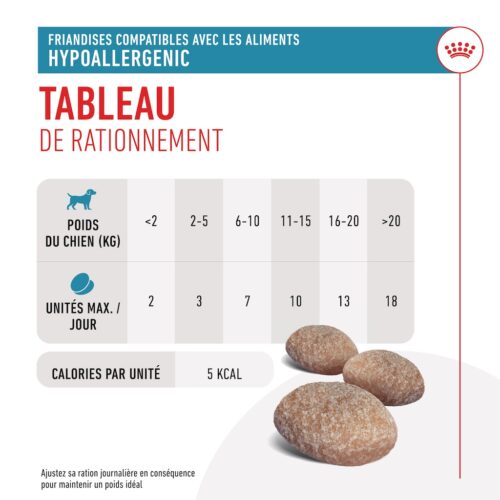 Ces friandises tendres et savoureuses complètent l’alimentation hypoallergénique de votre chien sans en compromettre les bénéfices.