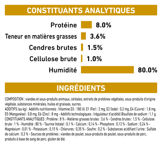 COMPOSITION : Viandes et sous-produits animaux, céréales, extraits de protéines végétales, sous-produits d’origine végétale, substances minérales, huiles et graisses, sucres. ADDITIFS (KG)** : Additifs nutritionnels : Vitamine D3 : 180 UI, Fer (3b103) : 2 mg, Iode (3b202) : 0,2 mg, Cuivre (3b405, 3b406) : 1,8 mg, Manganèse (3b502, 3b503, 3b504) : 0,8 mg, Zinc (3b603, 3b605, 3b606) : 8 mg - Additif technologique : Bisulfate de sodium : 1,1 g. ** Les valeurs reflètent seulement les niveaux ajoutés à la formule et non ceux naturellement présents dans les composants de l’alimentation.