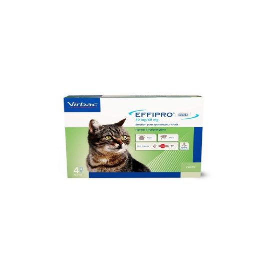 La solution spot-on EFFIPRO DUO S/O, pour chat, permet de traiter les infestations par les puces et les tiques. Existe en plusieurs conditionnements.