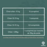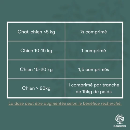 1 comprimé pour 10 kg de poids par jour dans la gamelle ou au moment du repas. Durée de la cure : au moins 4 semaines, à renouveler plusieurs fois par an.