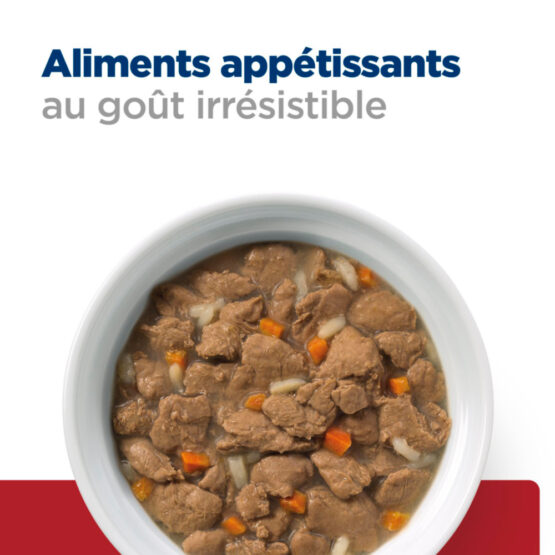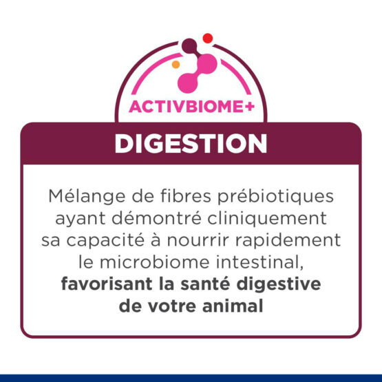 • Renforcée par la technologie des ingrédients Hill’s ActivBiome+, un mélange exclusif de prébiotiques, cliniquement prouvé pour nourrir rapidement le microbiome intestinal afin de soutenir la bonne santé digestive et le bien-être en général.