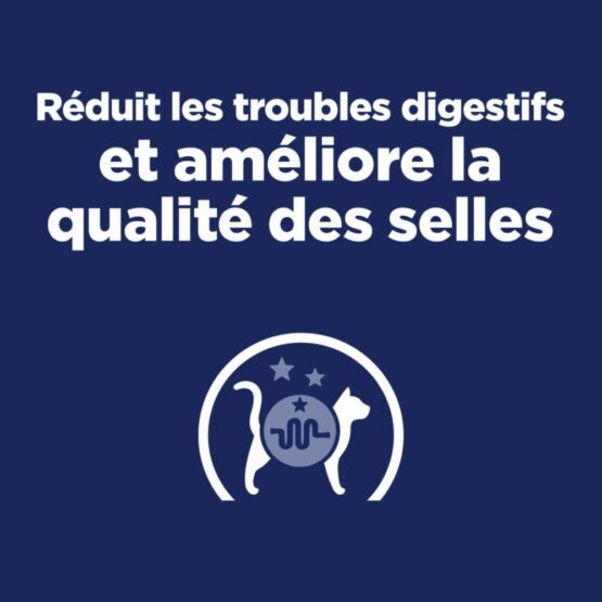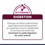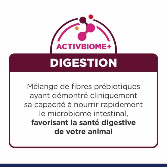 Formulé avec la technologie exclusive de Hill’s ActivBiome+ Digestion, un mélange exclusif de fibres prébiotiques, dont il a été cliniquement prouvé qu’il nourrit rapidement le microbiome intestinal afin de favoriser une qualité optimale des selles et une bonne santé digestive.