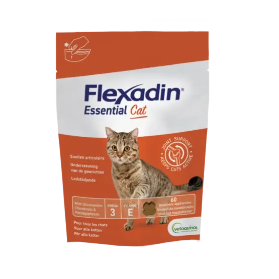 Flexadin Essential Cat est un aliment complémentaire sous forme de bouchée, pour soutenir les articulations des chats.