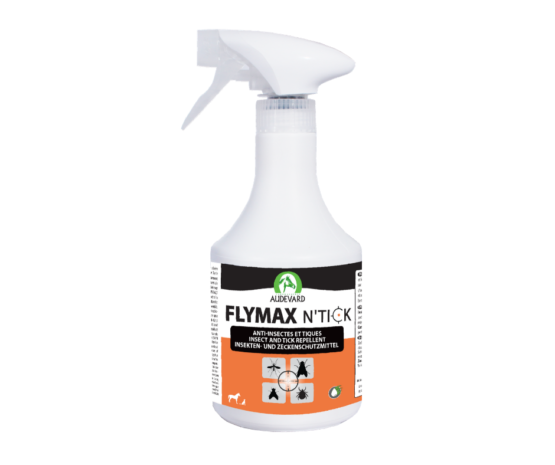 Flymax N’Tick est un spray répulsif puissant qui protège contre les insectes volants et les tiques chez le cheval et le chien.