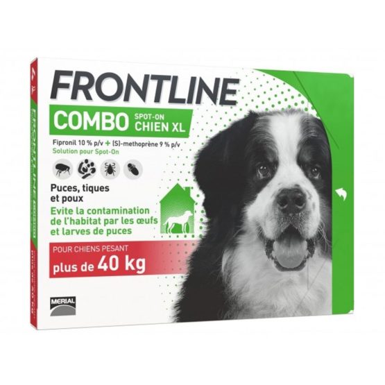 FRONTLINE COMBO Spot-On chien XL 40-60kg permet de lutter contre les parasites des chiens. Il est efficace contre les puces, les œufs et larves de puces grâce à sa formule enrichie à l’IGR, les poux du chien et les tiques.