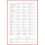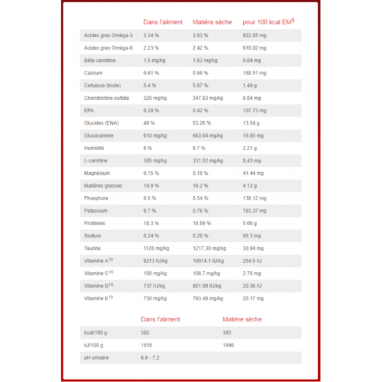 Constituants Analytiques: Protéines 17,6%, Teneur en matières grasses 14,7%, Cellulose brute 5,3%, Acides gras oméga-3 3,3%, EPA 0,39%, Cendres brutes 4,4%, Calcium 0,61%, Phosphore 0,48%, Sodium 0,23%, Potassium 0,71%, Magnésium 0,15%; par kg: Vitamine A 9 180UI, Vitamine D3 705UI, Vitamine E 600mg, Vitamine C 90mg, Bêta-carotène 1,5mg, Glucosamine 608mg, Sulfate de chondroïtine 323mg, L-Carnitine 305mg.