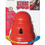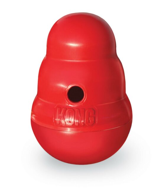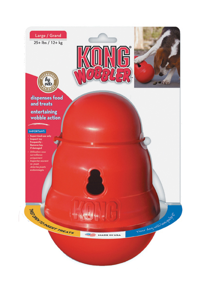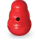 La balle à friandises KONG Wobbler est fabriquée en polymère alimentaire très résistant pour offrir de longues heures de jeu à votre chien. De couleur rouge, elle existe en plusieurs tailles.