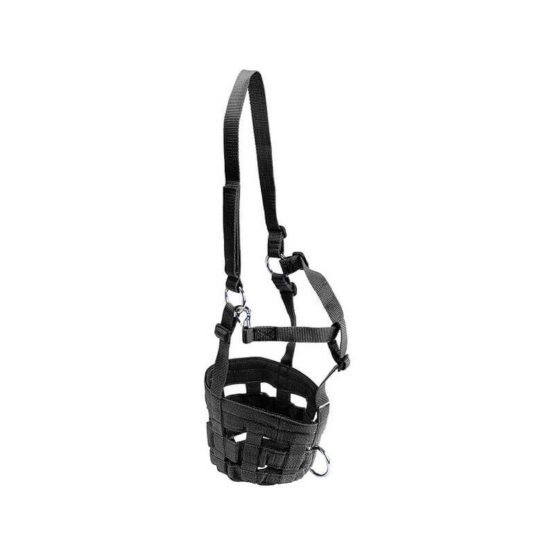 Muselière licol en nylon contient un panier obligeant le cheval à manger plus lentement et en moindre quantité, ce qui diminue les risques de fourbure.