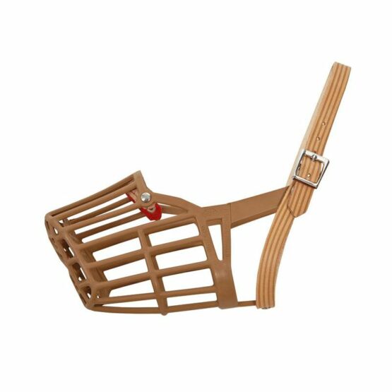Fabriquée en plastique résistant spécial. Renforcée au niveau du nez et avec un solide collier en cuir.