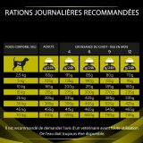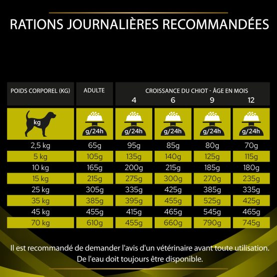 Utilisable chez les chiots à partir de 4 mois. Pour les chiens adultes de plus de 70kg : ajouter 20 g de croquettes pour 5 kg de poids corporel supplémentaire. La durée d’utilisation recommandée est initialement jusqu’à 6 mois. De l’eau propre et fraîche doit être en permanence à disposition. Avant utilisation ou avant prolongation de la durée d’utilisation, il est recommandé de demander l’avis d’un vétérinaire.