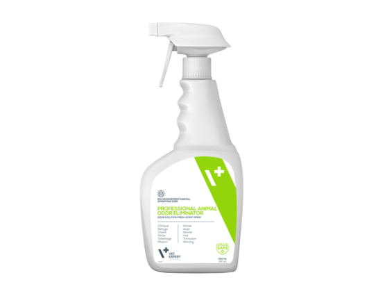 Produit professionnel multi-usage conçu pour éliminer durablement toute odeur d’origine animale dans les cliniques vétérinaires, les chenils, les refuges, à la maison etc.