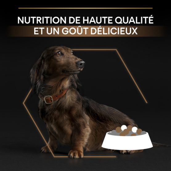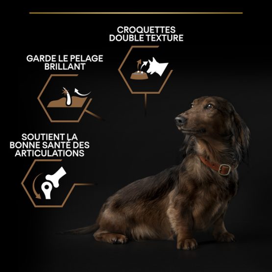 Une combinaison unique de petites croquettes croustillantes et de tendres petits morceaux effilés pour une alimentation complète chez le chien de petite taille.