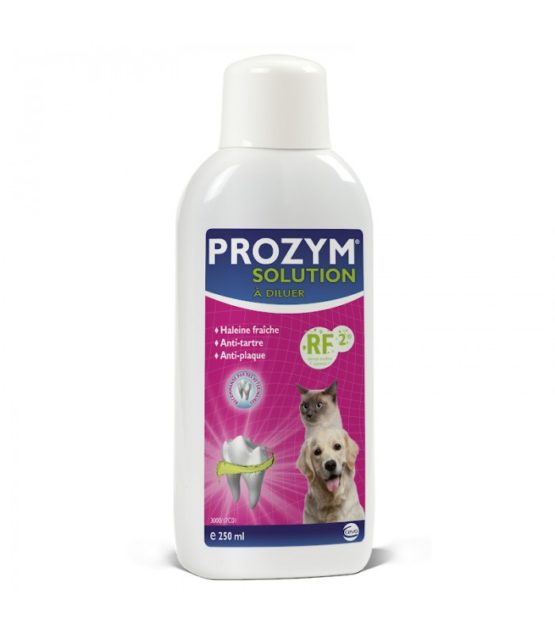 La solution buvable PROZYM RF2, pour chien et chat, aide l’animal à garder une bonne hygiène dentaire.