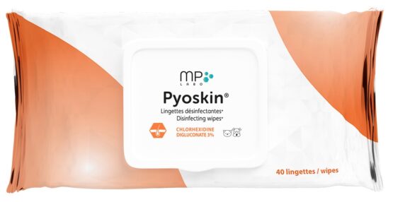 Pyoskin Wipes sont des lingettes nettoyantes et désinfectantes grand format à 3 % de chlorhexidine.