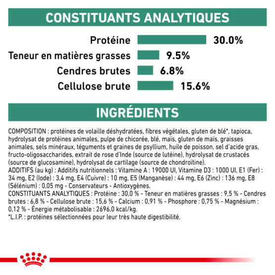 Protéines de volaille déshydratées, fibres végétales, gluten de blé, tapioca, gluten de maïs, hydrolysat de protéines animales, pulpe de chicorée, maïs, blé, graisses animales, téguments et graines de psyllium, sels minéraux, huile de poisson, sel d'acide gras, Fructo-Oligo-Saccharides, hydrolysat de crustacé (source de glucosamine), extrait de rose dinde (source de lutéine), hydrolysat de cartilage (source de chondroïtine).