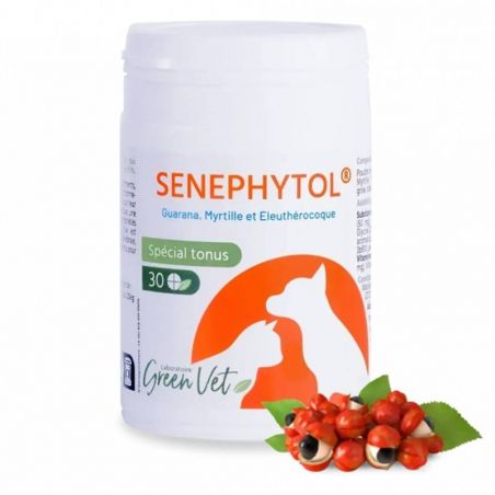 Senephytol est un aliment complémentaire à base d’extraits de Guarana et d’Eleuthérocoque pour donner du tonus aux chiens et chats. Cette formule participe à apporter chez les animaux âgés ou sportifs : un effet de protection cérébrale contre la dégénérescence neuronale responsable de certaines déficiences cognitives, un effet anti-âge par la capacité de ses constituants qui contribuent à lutter contre les stress oxydatifs auxquels sont soumises toutes les cellules de l’organisme au cours de la vie, et un effet “énergisant” pour les chiens sportifs : coup de fouet, tonification et soutien de la fonction cardio-respiratoire à l’effort. Meilleure oxygénation donc amélioration des capacités musculaires en activité et meilleure récupération.