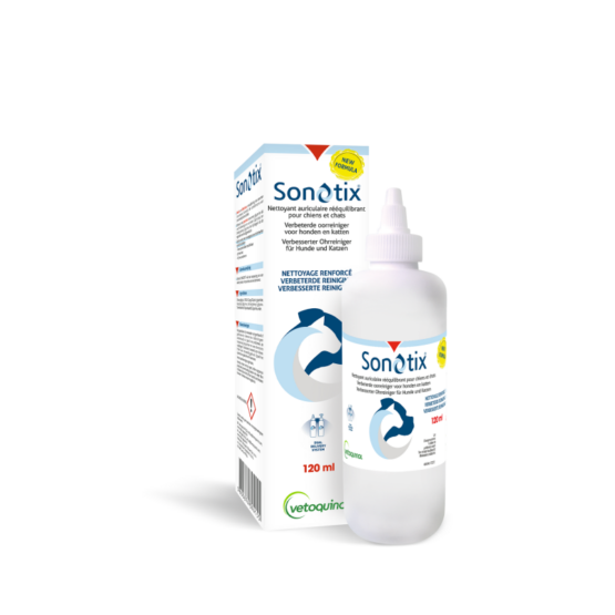 La lotion auriculaire Sonotix Vetoquinol est un nettoyant auriculaire rééquilibrant pour chiens et chats.