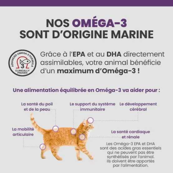 - Les acides gras Oméga-3 EPA et DHA (issus d’huile de poisson) ont un effet bénéfique sur la santé de la peau, du pelage et des articulations chez les chats âgés. Ils ont également une action favorable sur la fonction rénale, la pression artérielle et les lipides sanguins.