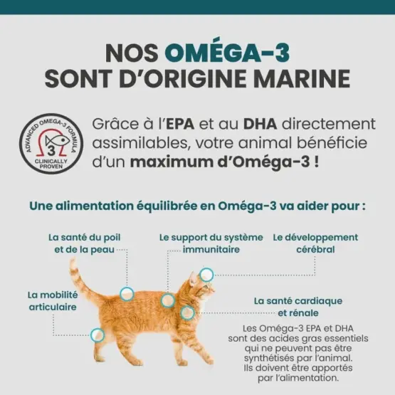 - Les acides gras Oméga-3 (EPA et DHA issus d’huile de poisson) ont des effets bénéfiques sur la peau et le pelage et aident à maintenir une bonne mobilité articulaire chez les chats en surpoids.