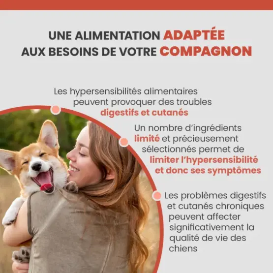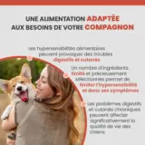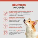 Aliment diététique complet pour chien adulte et senior qui réduit les intolérances à certains ingrédients et nutriments ainsi que le risque de malabsorption intestinale aiguë, et compense la maldigestion et l’insuffisance pancréatique exocrine.