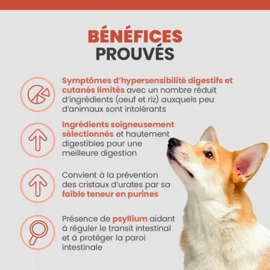 Contre-indications : Chiots et chiennes gestantes ou allaitantes, hypersensibilité connue à l'oeuf et/ou au riz.