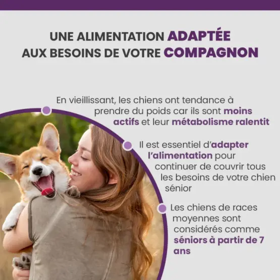 - Alimentation quotidienne du chien de race moyenne (de 10 à 25 kg) âgé de 7 ans et plus, stérilisé ou non